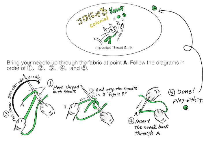 Colonial Knot Stitch demonstrated by a cat