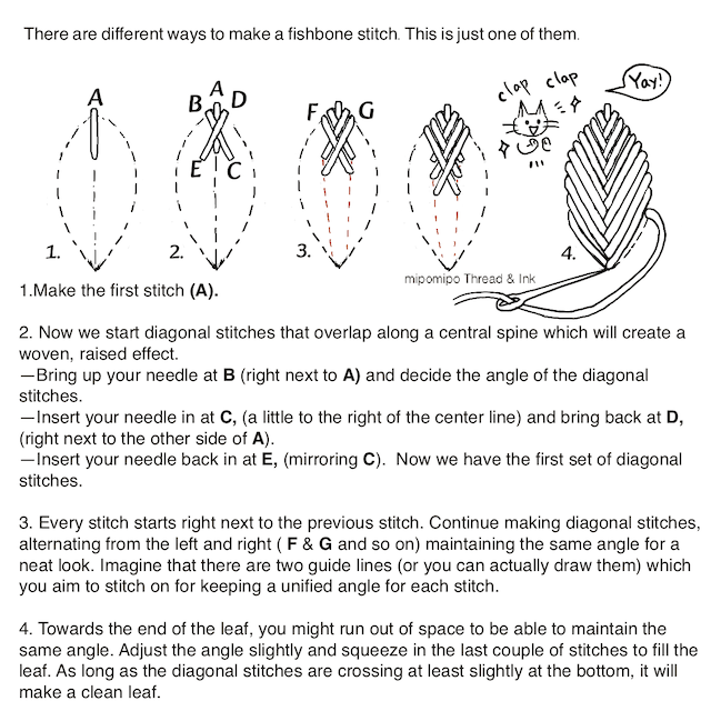 The fishbone stitch fills areas like leaves and petals with a smooth, slightly raised texture. Work along a center line, stitching alternately left and right so threads overlap toward the tip and form a V-shaped, scaled pattern. Keep stitch length consistent and tension a bit looser at the base, firmer toward the tip, for a tapered look. Finish with small anchoring stitches and press gently from the back to settle the threads.